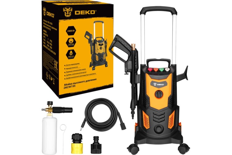 Мойка высокого давления DEKO DKCW190 предназначена для мытья транспортных средства (машин, лодок, мотоциклов и т.д.), очистки загрязненных поверхностей при помощи чистой воды под высоким давлением (при необходимости с добавлением моющих средств) в бытовых условиях. Компактный размер и наличие колес делают данную модель удобной для транспортировки и хранения. Мойка оснащена функцией Автостоп. Надежная алюминиевая помпа имеет небольшой вес и не подвергается процессу коррозии. Мойка может забирать воду из любого подходящего источника - водопровода, садовой бочки или водоема. 8-метровый шланг не ограничивает передвижение пользователя по рабочей площадке.