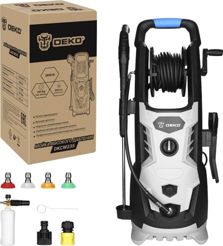 Мойка высокого давления DEKO DKCW235 предназначена для мытья транспортных средства (машин, лодок, мотоциклов и т.д.), очистки загрязненных поверхностей при помощи чистой воды под высоким давлением (при необходимости с добавлением моющих средств) в бытовых условиях. Мойка оснащена функцией Автостоп. Надежная алюминиевая помпа имеет небольшой вес и не подвергается процессу коррозии. Мойка может забирать воду из любого подходящего источника - водопровода, садовой бочки или водоема.
