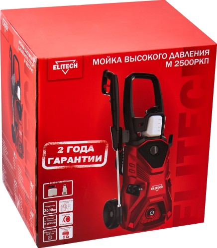 Мойка Elitech мощностью 2,5 кВт и рабочим давлением 125 бар является самовсасывающей и может осуществлять забор воды, как из водопровода, так и из отдельной ёмкости.
