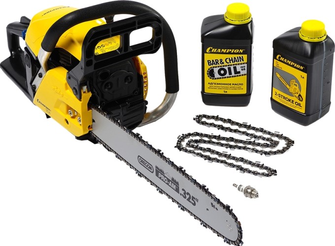 Бензопила CHAMPION A254-18 PROMO + подарочный набор используется при валке деревьев, обрезке ветвей, для распиливания заготовок из древесины.