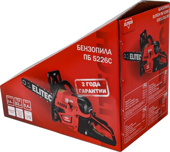 Бензиновая цепная пила Elitech ПБ 5226С мощностью 2,6 л.с. и с шиной длиной 38 см, предназначена для валки деревьев, обрезки веток и сучьев, раскряжевки и заготовки дров. Может применяться для плотницких работ, расчистки местности от кустарников и молодой поросли деревьев, и других хозяйственных работ, связанных с пилением древесины. Цепная пила оснащена двухтактным двигателем внутреннего сгорания, работающим на смеси бензина и 2-тактного масла, приводящим в движение пильную цепь, двигающуюся по направляющей шине.