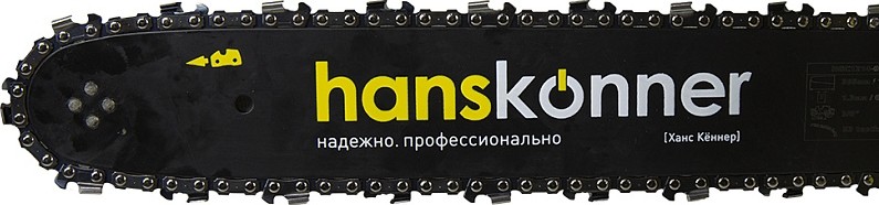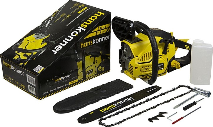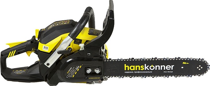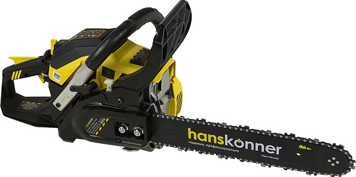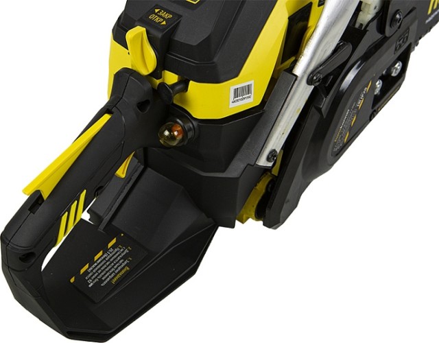 Безопасность работы обеспечивается предохранительной клавишей, предотвращающей случайное нажатие газа, ограничителем цепи, защитным щитком для правой руки, а также цепным тормозом, активируемым принудительно либо силой инерции. Два способа активации тормоза цепи повышают безопасность труда.