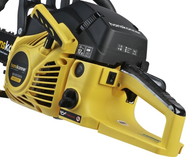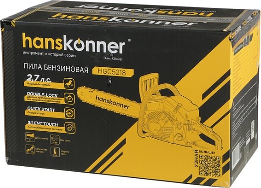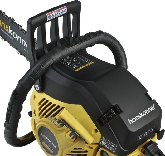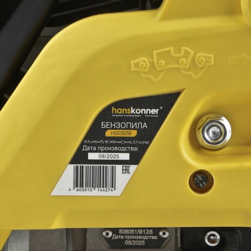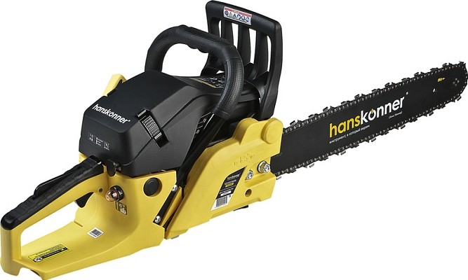Мощная и удобная бензиновая цепная пила HGC5218 с 18-дюймовой пильной шиной идеально подходит для валки деревьев, распиловки бревен и других работ в саду, на даче или в профессиональной деятельности.