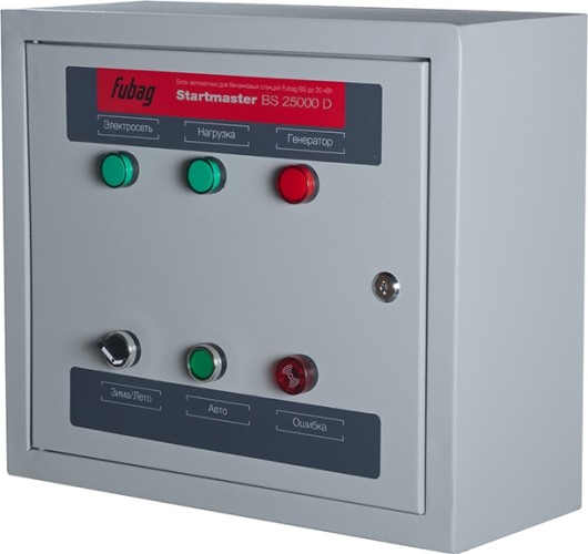 На передней панели блока вынесены органы управления станции и индикация режимов работы. Металлический корпус оснащён ушками для крепления на стену. В комплект с АВР Fubag Startmaster BS 25000 D входит 8 метровый кабель. Предназначен для совместной работы с трёхфазными бензиновыми электростанциями FUBAG, оснащенными разъемом для подключения блока автоматики: BS 6600 DA ES, BS 8500 DA ES, BS 11000 DA ES, BS 14000 DA ES, BS 17000 DA ES.