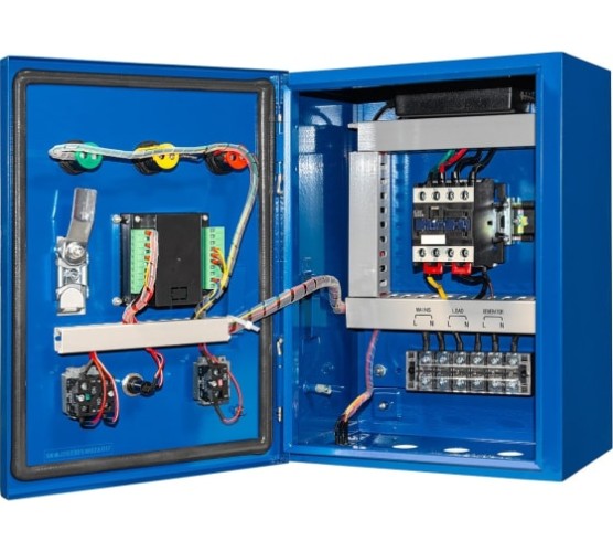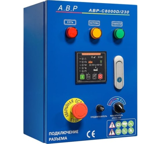 Блок АВР для дизельного генератора от 5 до 8 кВт/230 включает в себя систему автозапуска (автоматического ввода резервного электропитания). При появлении основного источника электропитания происходит отключение электростанции. Блок автоматического управления для контроля наличия напряжения в сети.