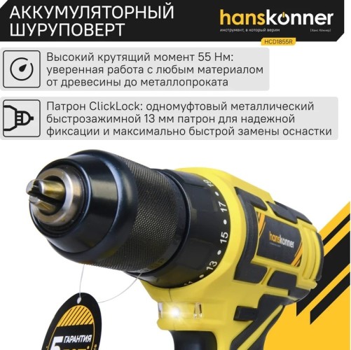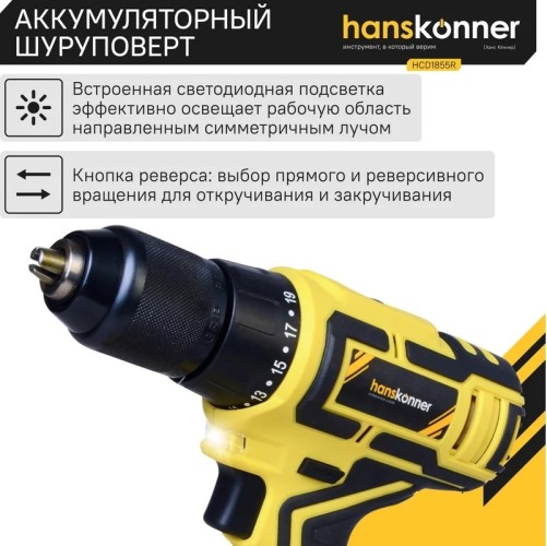Аккумуляторная дрель-шуруповерт Hanskonner HCD1855R подходит для любых работ, в том числе в стесненных условиях и труднодоступных местах без снижения производительности и потери качества работ.