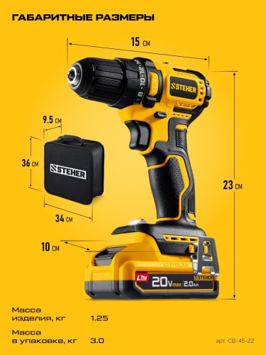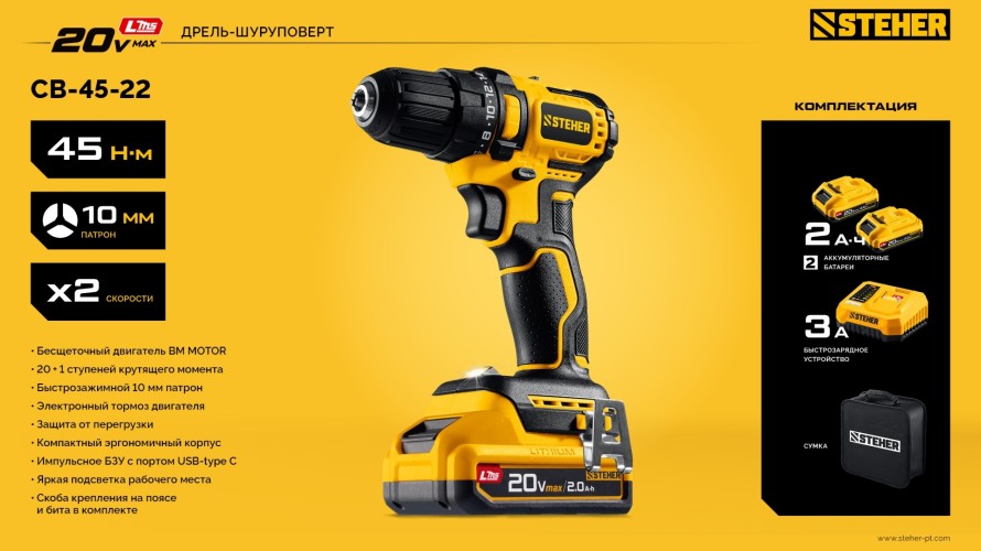 Бесщеточная дрель-шуруповерт STEHER обеспечивает как точное заворачивание маленьких саморезов, так и уверенное закручивание крупного крепежа до 8мм. Компактный размер и современный дизайн делают ее удобной для работы. Комплектация с двумя аккумуляторами позволяет работать практически без остановки.