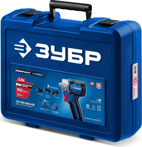 ЗУБР Профессионал Компакт Комби, 20 В, 50 Н·м, 2 АКБ LMS (2 А·ч), бесщеточная дрель-шуруповерт, кейс DB-50-22-H3 - высокотехнологичная модель в новой линейке аккумуляторного инструмента ЗУБР серии LMS.