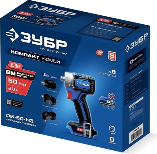 ЗУБР Профессионал Компакт Комби, 20 В, 50 Н·м, без АКБ (LMS), бесщеточная дрель-шуруповерт DB-50-H3 - высокотехнологичная модель в новой линейке аккумуляторного инструмента ЗУБР серии LMS.