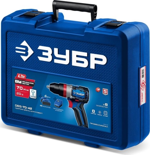ЗУБР Профессионал 20 В, 70 Н·м, 2 АКБ LMS (4 А·ч), бесщеточная ударная дрель-шуруповерт, кейс DBS-70-42 - высокотехнологичная модель в новой линейке аккумуляторного инструмента ЗУБР серии LMS.