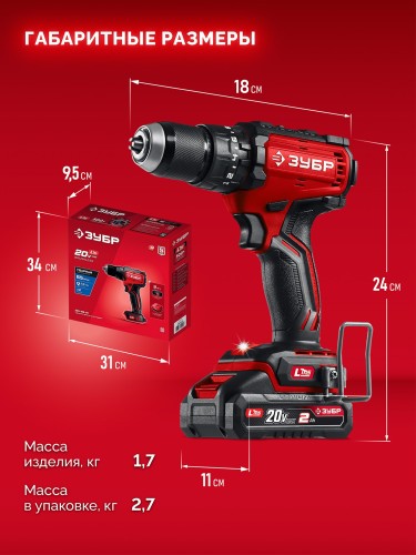 Дрель-шуруповерт аккумуляторная ЗУБР ДБУ-65-21 20 В, 65 Н·м, 1 АКБ LMS (2 А·ч), бесщеточная ударн