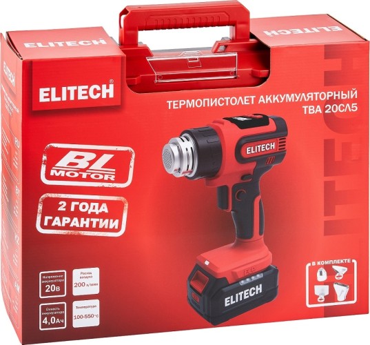 Термопистолет аккумуляторный ELITECH ТВА 20СЛ2 используется для выполнения следующих видов работ: снятия лакокрасочных покрытий с любых поверхностей, пайки и формовки пластика, деформации плексигласа, ПВХ и полистирольных плит, защиты проводов и кабелей термопластичной оболочкой, пайки мягким припоем и лужение, сварки или резки линолеума, рубероида и т. д., ускорения процессов склеивания, размораживания, сушки и продувки поверхностей, заделки щелей с помощью пластиковой сварочной ленты.
