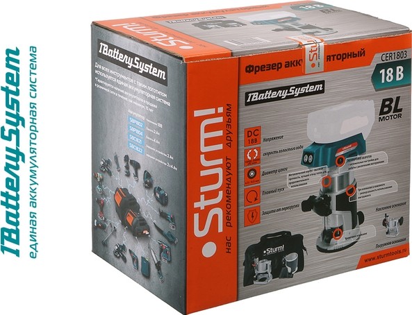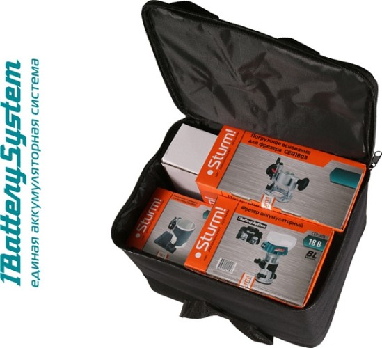 1BatterySystem - универсальная аккумуляторная система. Подходит ко всей линейке аккумуляторного инструмента Sturm! Сменные батареи будут в продаже в течение 15 лет. Инструмент 3 в1! В комплекте 3 основания для выполнения всего спектра работ доступного фрезеру.