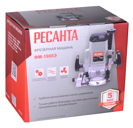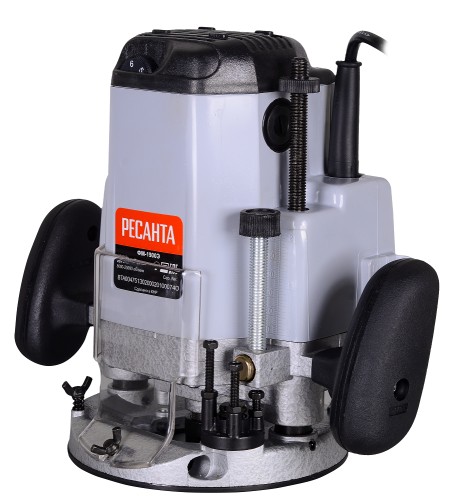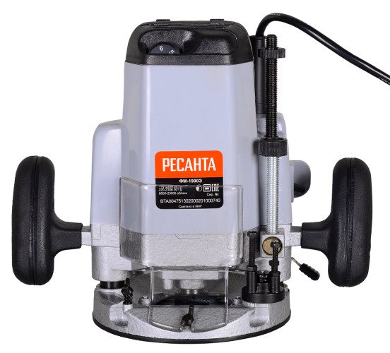 Фрезер сетевой РЕСАНТА ФМ-1900Э - предназначен для фрезерования изделий из древесины, древесно-стружечных плит и пластмасс. Фрезерная машина состоит из основания и электропривода, которым служит коллекторный электродвигатель переменного тока, размещенный в пластмассовом корпусе. Корпус соединен с основанием направляющими колонками, жестко закрепленными в основании. Соединение колонок с корпусом подвижное, обеспечивающие подъем/опускание фрезы. Подъем привода фрезы вверх осуществляется за счет разжимного усилия пружин, установленных на колонках в корпусе привода. Привод фиксируется в необходимом вертикальном положении с помощью рычага.