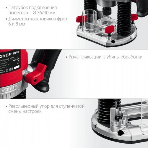 Фрезер сетевой ЗУБР ФМ-1650 предназначен для фрезерования (в т.ч. фигурного, по шаблону, по радиусу) заготовок из дерева, древесно-стружечных плит, пластмасс и металла (при установке соответствующих фрез)