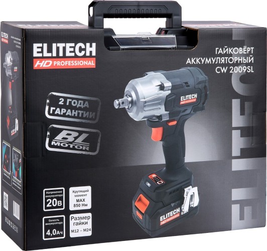 Особенности: 3 режима работы, шпиндель 1/2"" для передачи большого крутящего момента, BL (бесщеточный) мотор, аккумулятор Elitech ELP 20В 4Ач, крутящий момент MAX 850 Нм, реверс, подсветка рабочей зоны, диаметр винта М12 – М24.