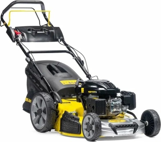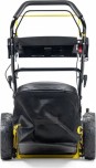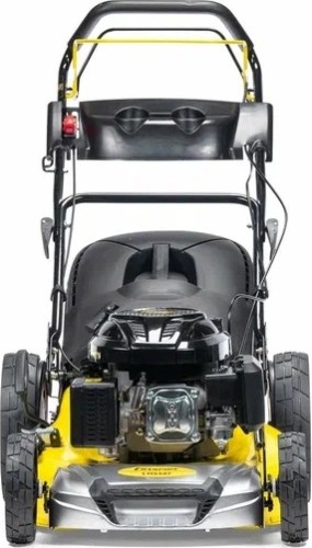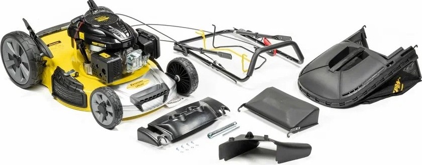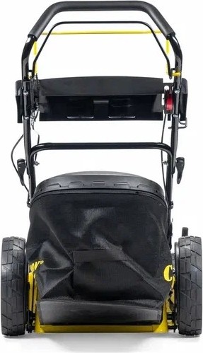 Травосборник вмещает до 70 литров скошенной травы. Нижняя часть травосборника выполнена из синтетической ткани, а верхняя из ударопрочного пластика. В верхнюю пластиковую часть сборника встроена ручка для удобства съема и опорожнения от собранной травы. У косилки большие задние колеса для удобства движения по высокой траве и кочкам на участке. Все колеса поднимаются и опускаются одним рычагом. Такая система регулировки называется центральной и имеет 8мь фиксированных позиций. Корпус косилки стальной, окрашенный в желтый цвет. Рукоятка косилки эргономичная, выполнена из стальных полых трубок, собранных при помощи специальных зажимов. На панели оператора выведена ручка регулировки оборотов двигателя.