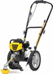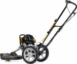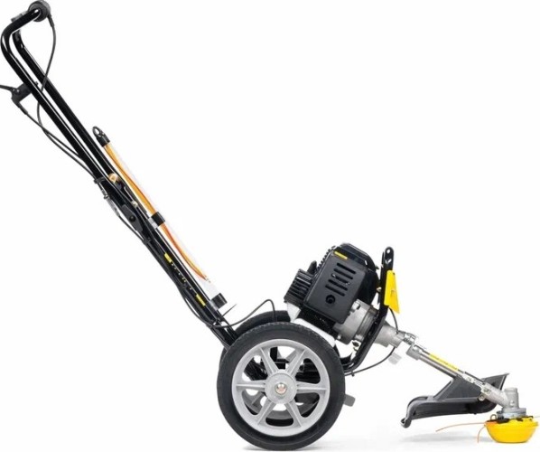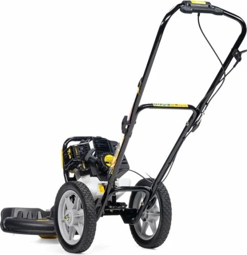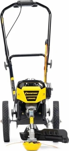 Газонокосилка бензиновая CHAMPION LMH 4412 – весьма интересно сконструированная модель для окашивания неровных участков площадью до 20 соток. Фактически эта модель - это тележка с колесами, к которой приделан обычный двухтактный триммер с укороченной штангой. Такая конструкция технологически легче и проще чем стандартные модели колесных триммеров, но при этом она отлично справляется со своей функцией - уменьшение нагрузки на оператора при работе. Двухтактный двигатель прост в эксплуатации и намного более дешев в ремонте. При этом двухтактный двигатель очень оборотистый, и, не смотря на свою небольшую мощность, показывает довольно хорошую производительность.