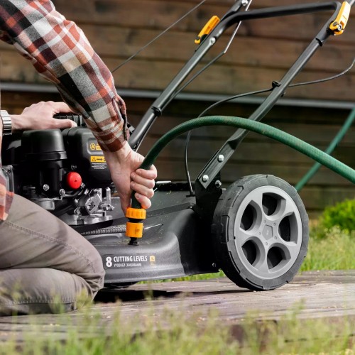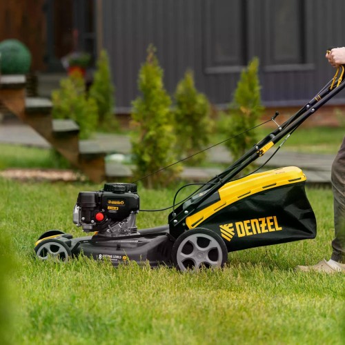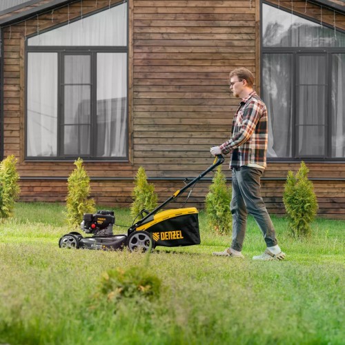 Газонокосилка бензиновая DENZEL GLR-510SP-ZS 51 см, привод, травосборник 65 л, с надежным и экономичным 4-тактным двигателем объемом 171 см3, обеспечивает ширину прохода 51 см. Предназначена для стрижки газонов и скашивания травы в саду, будет полезна для ухода за дачным участком или придомовой территорией большой площади. Высота скашивания легко регулируется одним рычагом в диапазоне 25-70 мм (предусмотрено 8 уровней).