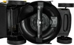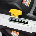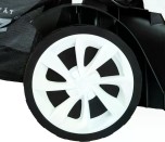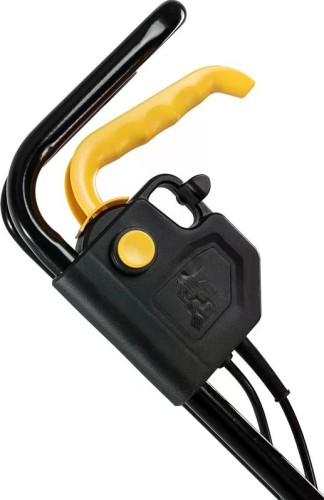 Управление косилкой осуществляется с помощью скобы, что позволяет пользователю держать руки в удобном положении и управлять одной рукой, если это потребуется. Широкие колеса также облегчают управление и перемещение.