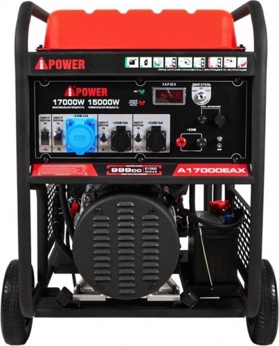 A-iPower A17000EAX оснащен мощным гильзованным 4-тактный OHV-двигателем объемом 999 куб. см с электростартером . На панели управления находится две стандартная розетка 230В/16А, одна силовая розетка 230В/32А, и разъем USB, от которого можно подзарядить смартфон, планшет и другие гаджеты. На цифровой дисплей в режиме реального времени выводятся сведения о работе генератора.