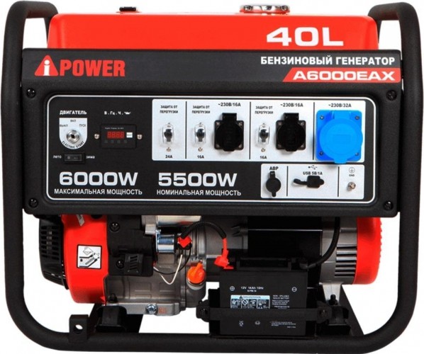 A-iPower А6000EAX оснащен гильзованным 4-тактный OHV-двигателем объемом 389 куб. см с электростартером . На панели управления находится две стандартная розетка 230В/16А, одна силовая 230в/32А и разъем USB, от которого можно подзарядить смартфон, планшет и другие гаджеты. На цифровой дисплей в режиме реального времени выводятся сведения о работе генератора. Уникальность этой модели в наличии режима Зима/Лето на панели генератора при подключении АВР для легкого запуска в любое время года.