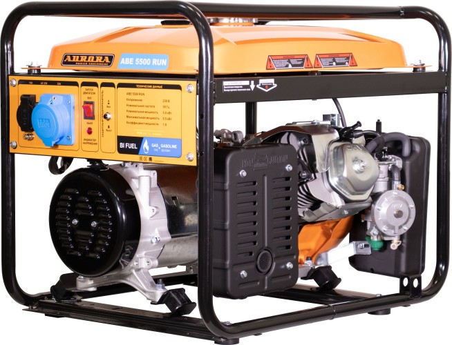 Генератор Aurora ABE 5500 RUN - это автономный источник электроэнергии. Главная особенность аппарата - это возможность работы с двумя видами топлива: бензин АИ92 и пропанобутановая газовая смесь. Модель отлично подойдет для автономного энергоснабжения дорожных бригад, строительных и ремонтных подразделений, обеспечения электричеством загородных домов, дач и т.д. Генератор реализован на базе одноцилиндрового 4-х тактного двигателя с верхним расположением клапанов (OHV). Поршни мотора гильзованы чугунными вставками, а значит силовая установка будет служить владельцу долгие годы. Встроенный автоматический стабилизатор (AVR) предотвращает скачки напряжения при изменении числа оборотов двигателя. Устройство контролирует значение напряжения для нормальной работы всего оборудования подключенного к генератору при увеличении или уменьшении нагрузки. Датчик масла не допустит работу двигателя в сухую. При падении уровня – электрическая сеть размыкается и глушит мотор, для того, чтобы уберечь владельца от расходов на дорогостоящий ремонт. Облегчённая конструкция значительно снижает вес устройств, при этом надёжно фиксирует все элементы конструкции. Лаконичная конфигурация электростанции позволяет легко обслужить оборудование и без проблем добраться до любого узла в случае необходимости настройки или ремонта.