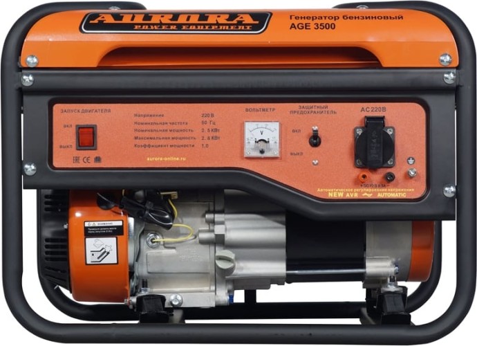 Бензиновый генератор Aurora AGE 3500 6771 - современный агрегат для резервного снабжения электричеством разного рода техники. Установка находит применение в профессиональной и бытовой сфере. Однофазная розетка для подключения электроприборов надежно защищена пластиковой крышкой от попадания пыли и влаги. В конструкции модели предусматриваются демпферные подушки для снижения уровня вибраций. Жесткая рама позволяет предохранять генератор от механических повреждений. Модель оборудована воздушным фильтром, который обеспечивает стабильную работу без перегрева. Одноцилиндровый 4-х тактный бензиновый двигатель с верхним расположением клапанов, который установлен на генераторе, является аналогом двигателя HONDA. Поршни мотора усилены чугунными гильзами, а значит, устройство прослужит своему хозяину много лет. Двигатели генераторов Aurora долговечны, обладают низким расходом масла на угар, экономят топливо и работают относительно тихо (74 Дб). OHV двигатель (с верхним расположением клапанов) очень надежен, долговечен, экономичен и менее шумный. Он устойчиво работает в широком диапазоне оборотов, эластичен. Эти свойства обусловлены оптимальной формой камеры сгорания двигателя. Распредвал расположен в блоке цилиндров и имеет шестеренчатый привод от коленчатого вала. Это самая надёжная и компактная конструкция двигателя. Нет ремня ГРМ, который может лопнуть или цепи, которая может перескочить и сбить фазы газораспределения. Новая усиленная рама генератора надёжно фиксирует все элементы конструкции, а кожух бензобака обеспечивает его дополнительную защиту. Стоит обратить особое внимание на наличие на всех генераторах Aurora блока NEW AVR (Automatic Voltage Regulator), который предназначен для стабилизации выходного напряжения при изменении оборотов двигателя. Данное устройство гарантирует стабильную работу подключенного к генератору оборудования. Ещё одним преимуществом генераторов Аврора перед конкурентами является медная обмотка ротора и статора устройства. Медь по сравнению с алюминием обладает меньшим удельным сопротивлением и лучшими показателями электропроводности. Это значит, что во время работы генератор с медными обмотками будет греться гораздо меньше конкурентов с алюминиевыми обмотками. В следствие меньшего нагрева меди повышается надежность изоляции и стойкость к неблагоприятным условиям окружающей среды: высокой температуре, влажности или запылённости. Так же стоит отметить значительно лучшие прочностные характеристики меди и её стойкость к окислению.