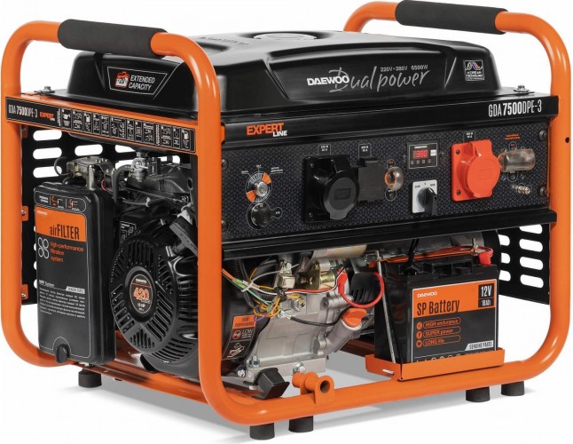 Бензиновый генератор DAEWOO GDA 7500DPE-3 отличается простотой управления. Медная обмотка альтернатора обеспечивает высокую отдачу мощности как для однофазного, так и для трехфазного тока, а также дает возможность работы до 18 часов при 50% нагрузки. Электронный блок автоматического контроля (AVR) гарантирует подачу качественного тока. Многофункциональный дисплей предназначается для визуального контроля над основными рабочими параметрами (напряжение, частота тока). Разъем ATS позволяет подключить систему автономного управления агрегатом. Благодаря системе защиты от перегрузок вероятность короткого замыкания исключается. Бортовой аккумулятор и электрический стартер служат для комфортной эксплуатации, что особенно важно для начинающего пользователя.