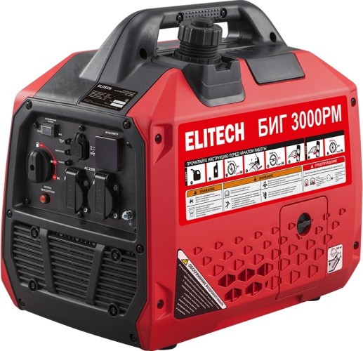 Генератор бензиновый ELITECH БИГ 3000РМ инверторный, мощностью 3 кВт (2,8 кВт) с 4-х тактным бензиновым двигателем предназначен для работы в качестве автономного источника электроэнергии переменного однофазного тока напряжением 230В, частотой 50Гц.
