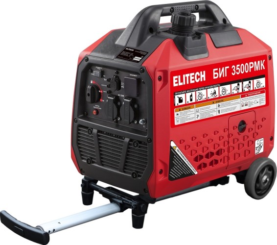 Генератор бензиновый ELITECH БИГ 3500РМК инверторный, мощностью 3,5 кВт (3,2 кВт) с 4-х тактным бензиновым двигателем предназначен для работы в качестве автономного источника электроэнергии переменного однофазного тока напряжением 230В, частотой 50Гц.