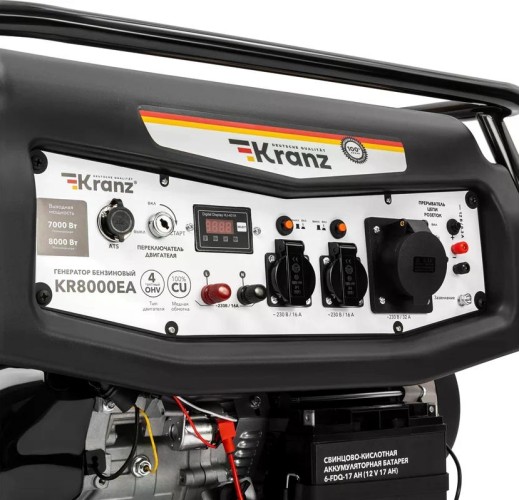 Бензиновый генератор KR8000EA с коннектором автоматики 8-PIN предназначен для обеспечения электричеством большого загородного дома, магазина или строительной площадки. Работает на бензине АИ-92. Оснащен автоматической системой переключения питания основной сети электроснабжения на генератор для резервного питания электросети (для подключения требуется блок автоматики).