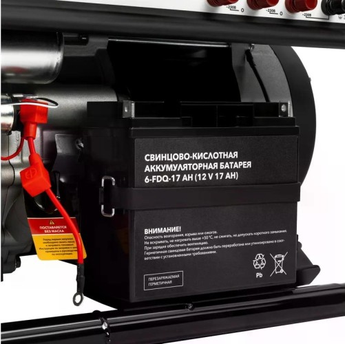 Генератор оборудован усиленным шнуром стартера, свечой зажигания Bosch, пылевлагозащитной кнопкой включения IP65, 2 силовыми розетками 16A и 32A, 1 евророзеткой 16A и выходом на 12 В. Предусмотрены индивидуальные предохранители розеток.