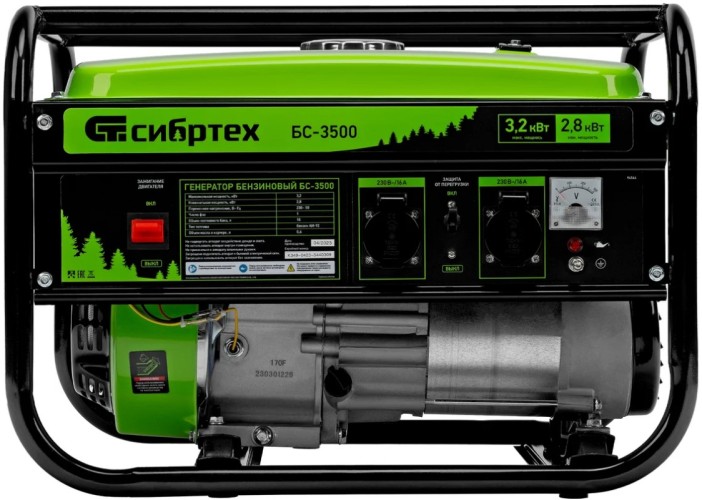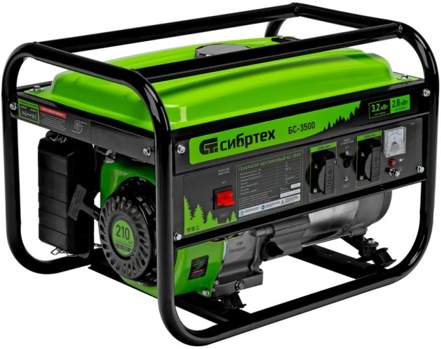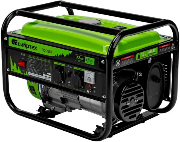 Бензиновый генератор Сибртех БС-3500 94544 на 230 В, максимальной мощностью 3,2 кВт, с 4-тактным двигателем, 15-литровым баком и ручным стартером, предназначен для электроснабжения дачи, кемпинга, небольшого магазина, гаража или строительной площадки. Весит всего 38,8 кг, что облегчает транспортировку, а значит, его можно брать на выездные работы или на природу. Выдаваемого напряжения 3,2 кВт хватает для одновременного подключения 4 ламп накаливания, холодильника, телевизора, электрочайника.