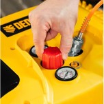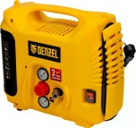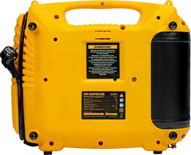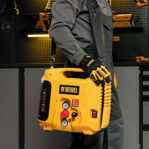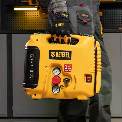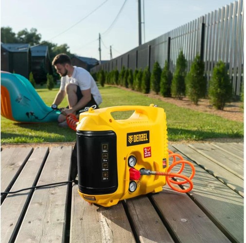 Компрессор поршневой безмасляный DENZEL DL1300 воздушный 10 бар, 180 л/мин, 5 л, с набором аксессуаров. Предназначен для обеспечения сжатым атмосферным воздухом нейлеров, степлеров, продувочных пистолетов, окрасочных и мовильных пистолетов и других пневмоинструментов, не требующих большого объема воздуха. Компрессор идеален для накачивания автомобильных шин, лодок, матрасов, мячей и прочих надувных изделий, а также для продувки труб водоснабжения.