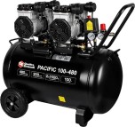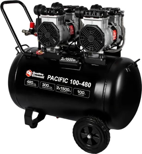 Компрессор поршневой безмасляный QUATTRO ELEMENTI PACIFIC 100-480 характеризуется внушительной производительностью 480 л/мин на входе и 300 л/мин на выходе. Оборудован объемным ресивером на 100 л, который обеспечивает непрерывную работу на протяжении длительного времени. Для простого перемещения по помещению предусмотрены большие транспортировочные колеса и высокая ручка.