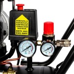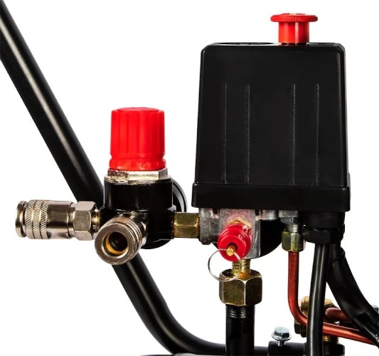 После включения компрессора в ресивер нагнетается воздух. При достижении максимума в 8 бар автоматика отключает двигатель. При работе подсоединенным пневматическим инструментом сжатый воздух расходуется и давление в ресивере падает. При снижении до 6 бар автоматика включает компрессорную группу для подкачки воздуха в ресивер. Процесс удобно контролировать с помощью манометров. Давление на выходе можно регулировать. Для слива конденсата предусмотрен клапан.