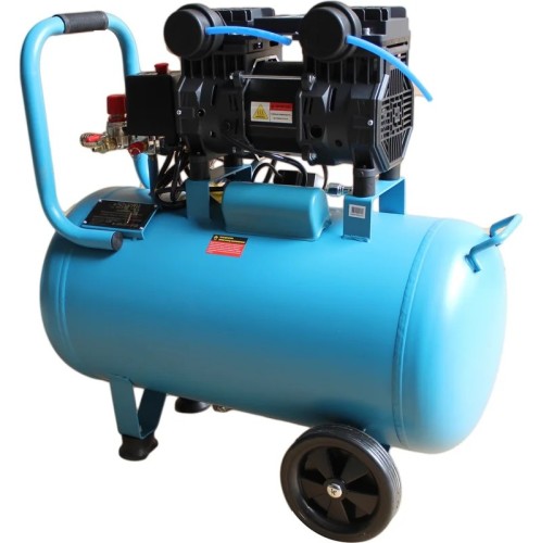 Безмасляный компрессор с 2-х цилиндровым мотором с пониженным уровнем шума, с увеличенным количеством оборотов 2650 об/мин, с двумя шлангами для нагнетания давления обеспечивает поднятие давления в 50-ти литровом ресивере с 0 до 8 атмосфер за 2 минуты; Защита от перегрева и Защита от перегрузки предохраняют компрессор от критических состояний. Реле и регулятор давления на входе и выходе с манометрами позволяют создавать давление максимально приближенное к требуемому потребителем, а также наглядно наблюдать и контролировать возможные перепады или недостатки компрессии.