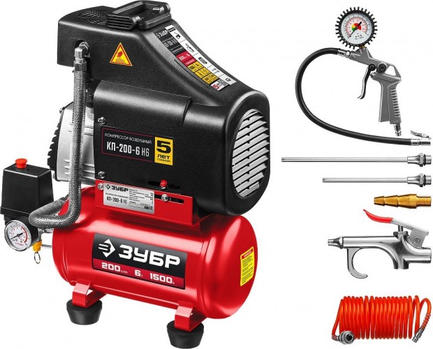 Компрессор поршневой безмасляный ЗУБР КП-200-6 Н6 с набором аксессуаров - качественное и надежное переносное оборудование для периодических работ дома, на даче, в небольшой мастерской, а так же для регулярной очистки от пыли офисной и бытовой техники . Безмасляный компрессор - это чистый, без примесей масла, воздух на выходе.