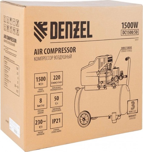 Воздушный компрессор с прямым приводом Denzel DC1500/50 используется для подачи сжатого воздуха к пневмоинструменту, например, пневмогайковерту, пневмодрели, пневмостеплеру, пневмозубилу. Благодаря использованию смазочного масла, которое снижает износ деталей, компрессор выдерживает длительную работу и подходит для профессионального применения в автомастерской, гараже или на строительной площадке.
