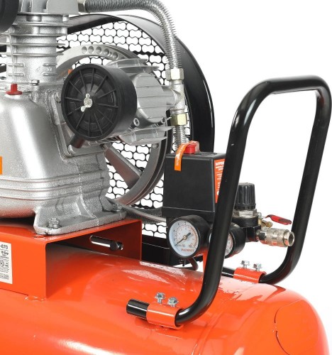 Оборудование оснащено мощным электроприводом и прочными чугунными цилиндрами, что гарантирует длительный срок службы. Производительность машины на входе составляет 670 литров в минуту, что позволяет подключать воздушные системы и несколько потребителей одновременно. Большой 100-литровый ресивер обеспечивает постоянное давление и сокращает время работы двигателя.