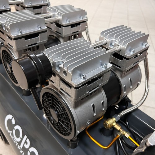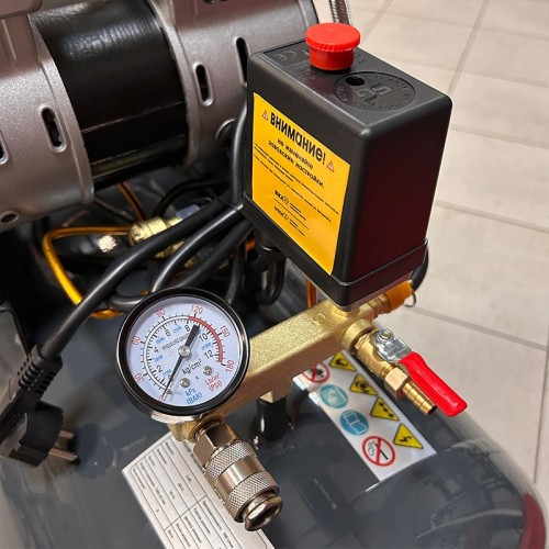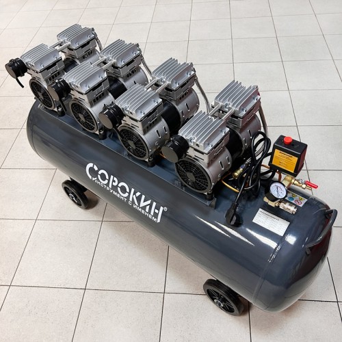 Малошумный компрессор оборудован безмасляной головкой, что обеспечивает получение чистого сжатого воздуха без примесей масла.