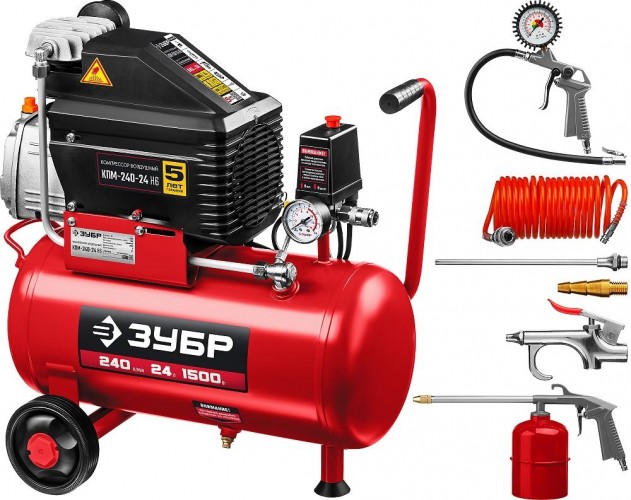 Компрессор поршневой ЗУБР КПМ-240-24 Н6 с набором аксессуаров для проведения широкого спектра работ. Агрегат отличается высокой производительностью, возможностью регулирования расхода воздуха и автоматическим режимом работы изделия.