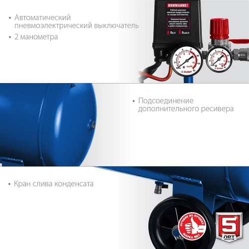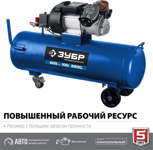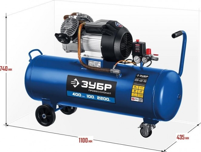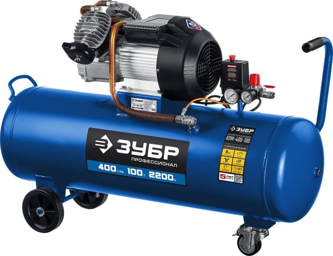 Компрессор поршневой ЗУБР КПМ-400-100 отличается увеличенным ресурсом, возможностью подключения двух инструментов, раздельно регулировать расход воздуха через каждый и автоматическим режимом работы изделия.