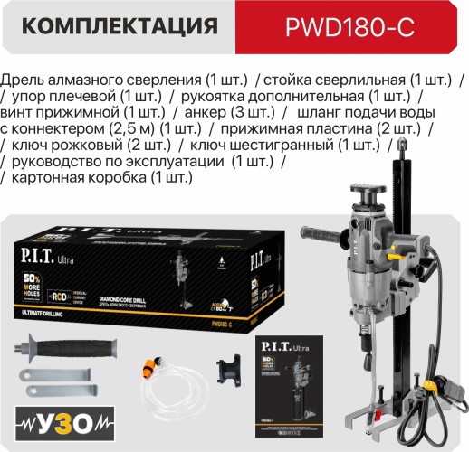 Машина алмазного бурения P.I.T. PWD 180-C ULTRA со стойкой предназначена для мокрого сверления алмазными коронками отверстий в бетоне, железобетоне, искусственном и природном камне, кирпичной и каменной кладке с подачей воды.
