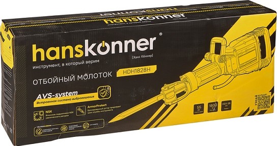 Отбойный молоток Hanskonner HDH1828H — мощный и практичный электроинструмент для разрушения конструкций из бетона, железобетона, кирпича и камня, дробления асфальтовых, бетонных и плиточных покрытий. Энергия удара в 55 Дж обеспечивает эффективное разрушение даже прочных конструкций. Модель отличается встроенной системой виброгашения «AVS-system», которая поддерживает удобство и безопасность при использовании молотка. Долговечности инструмента содействуют подшипники увеличенного ресурса от японской фирмы «NSK».