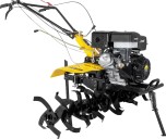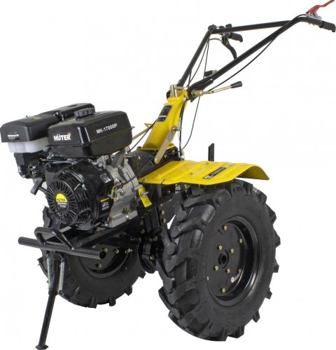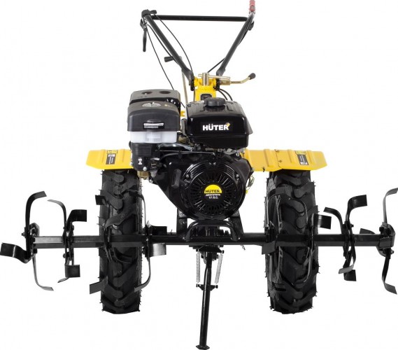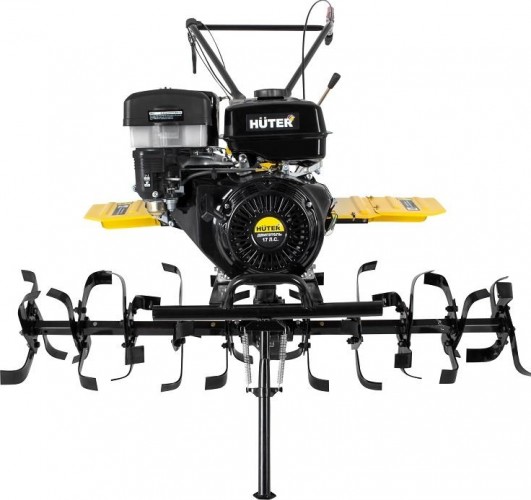 Сельскохозяйственная машина HUTER MK-17000P способна существенно упростить обработку почвы. Делает это она методом культивации, что предполагает рыхление земли фрезами без ее переворачивания. MK-17000P - самая мощная модель в линейке HUTER, она подойдет для больших объемов работы и сумеет не только сократить временные затраты на сельскохозяйственные работы, но и повысить их эффективность. Модель позволяет обработать полосу почвы за один раз шириной до 140 см. Четырехтактный оцилиндрованный двигатель с мощностью в 17 л.с. способен справиться с самыми грубыми и плотными почвами. Двигатель оснащен автоматическим регулятором частоты вращения. Это делает управление мотоблоком простым и удобным. Мотор имеет датчик контроля уровня масла. Он предохраняет двигатель от забывчивости оператора. При падении уровня масла до критического, машина заглохнет и ее не удастся завести. Четырехтактный оцилиндрованный двигатель с мощностью в 17 л.с. способен справиться с самыми грубыми и плотными почвами. Двигатель оснащен автоматическим регулятором частоты вращения. Это делает управление мотоблоком простым и удобным. Мотор имеет датчик контроля уровня масла. Он предохраняет двигатель от забывчивости оператора. При падении уровня масла до критического, машина заглохнет и ее не удастся завести. Сельскохозяйственная машина имеет 3 передачи: 2 передние и 1 заднюю. Это дает широкие возможности в обработке грунтов с различными характеристиками. Наличие универсальной сцепки позволяет применять широкий спектр навесного оборудования. Привод активной подвески – BOM 18 мм. Он более надежен, чем ременной, поскольку медленнее изнашивается. Приводные ремни защищены кожухом, который предотвращает травмы пользователя и попадание посторонних предметов в устройство. Фрезы закрыты защитными крыльями, поэтому комья земли и пыль не полетят в оператора машины. Управление мотоблоком вынесено на рукояти.