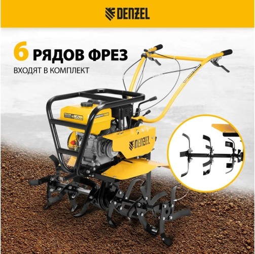 Мотоблок DENZEL DPT-470S-PRO 7 л.с с ременным сцеплением, двигателем объемом 212 см3 и мощностью 7 л.с., с коробкой передач 4 вперед/2 назад и шкивом отбора мощности, комплектуется 24 фрезами (3х4). Предназначен для выполнения земляных работ: прополки, вспахивания, боронования грунта, перевозки грузов и т.д.
