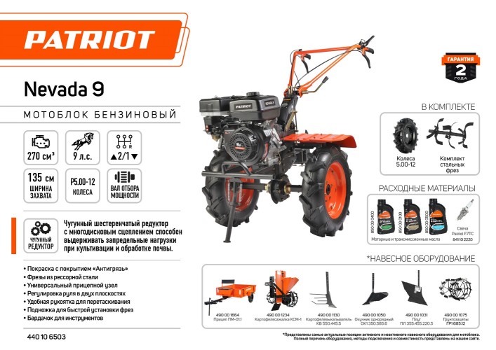 Мощный мотокультиватор с многодисковым сцеплением в масляной ванне и шестеренчатым редуктором с рекордной шириной культивирования, укомплектован фрезами и большими пневматическими колесами, что позволяет использовать мотокультиватор для культивирования, сразу "из коробки". Ножи на фрезах имеют усиленную конструкцию. Универсальный узел сцепки - самый распространённый и дает возможность устанавливать разнообразное навесное оборудование: плуги и окучники различной конфигурации. Тележка для мотокультиваторов подходит практически любая, а если и понадобится переделка, то она будет минимальна и ее можно произвести без обращения в сервисный центр. Отдельно можете приобрести и установить роторную косилку, помпу, тележку, плуг, окучник, картофелевыкапыватель.