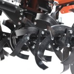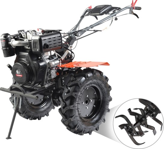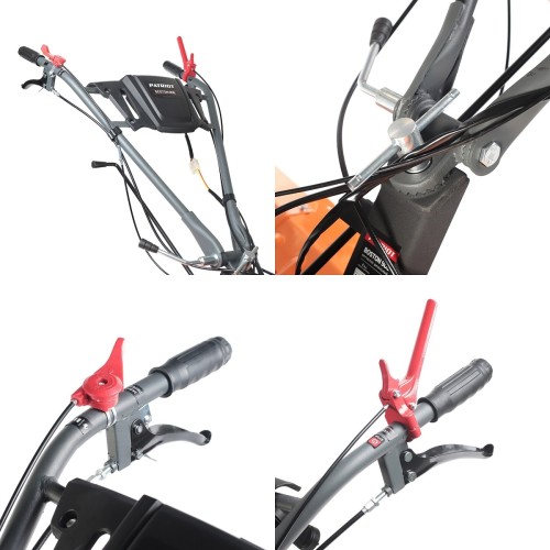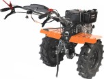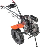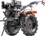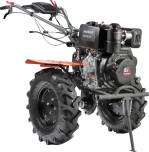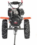 Чугунный шестеренчатый редуктор и дисковый механизм сцепления обеспечивают надежность и точность передачи, выдерживая большие нагрузки. Две передачи вперед и одна назад позволяют эффективно работать на тяжелой почве. Руль регулируется по наклону, на нем расположены кнопка включения, рукоятка газа, рычаги привода и кейс для ключей. Крепкие ручки и усиленная рама делают мотоблок устойчивым.